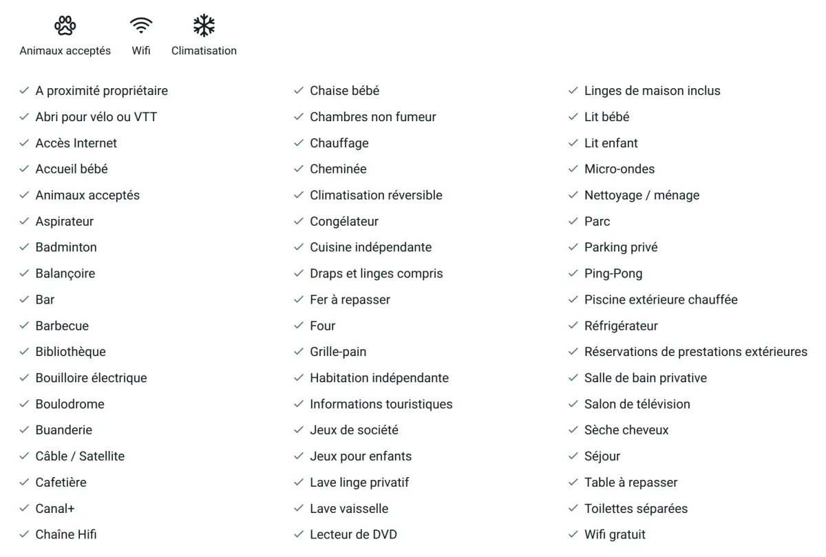 Elle facilite la vie de ses hôtes en proposant un abri sécurisé pour voitures et vélos, un bureau équipé d'une bibliothèque avec connexion fibre et wifi haut débit. Sa maison de vacances accepte les animaux de compagnie, rendant les séjours familiaux encore plus conviviaux.